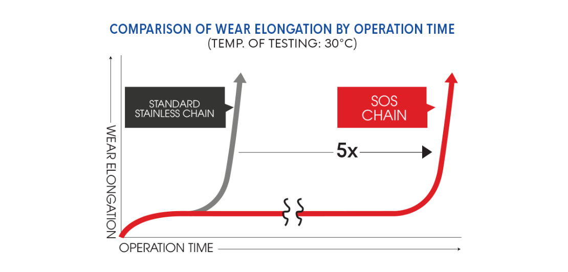 Sử dụng chất bôi trơn đạt chứng nhận NSF-H1 (có thể sử dụng ở nơi có thể vô tình chạm vào thực phẩm), không có vấn đề gì khi sử dụng cho máy thực phẩm. Cũng sản xuất xích SOS với chất bôi trơn công nghiệp tẩm bụi.